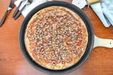Pepperoni, sausage, ground beef, green peppers, onion, mushroom, bacon over pizza sauce and mozzarella. Anchovies upon request.